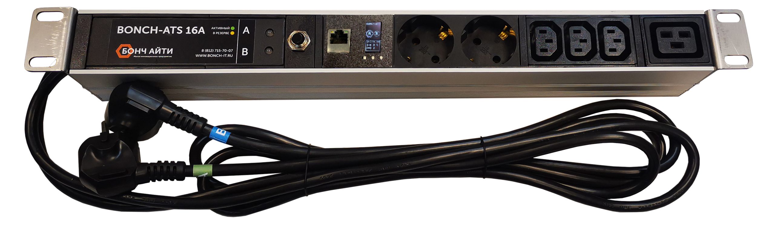 Bonch-ATS 16AАвтоматическое переключение питания — максимум надёжности для вашего оборудования. Поддержка нагрузки до 16A. Идеален для серверных стоек и телеком-оборудования.