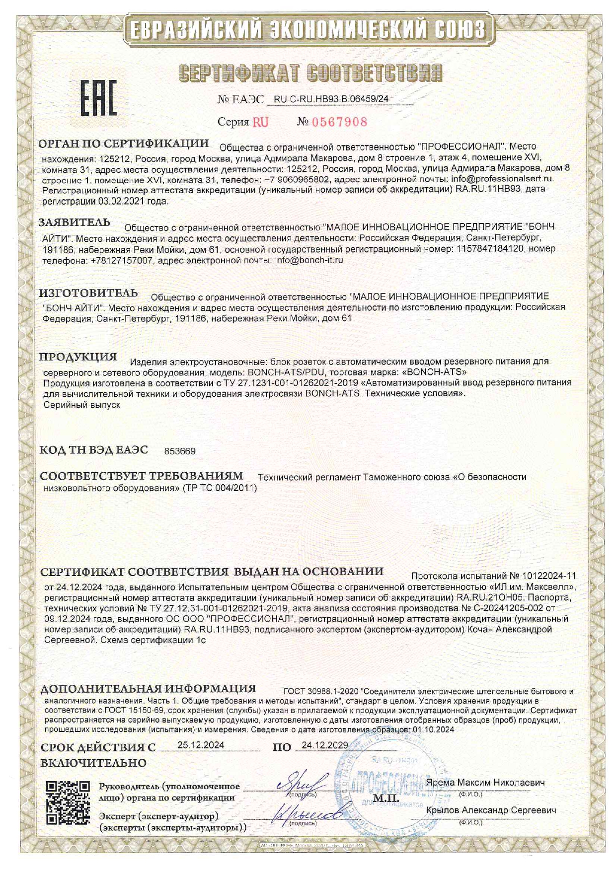 Горизонтальный ПДУ с функцией АВР для стандартного 19 дюймого шкафа имеет 2 розеток S, 3 розеток С13, 1 розетка С19 и кабели подключения питания длиной 1.7 м. с вилками C14. Эта модель BONCH-ATS/PDU оснащена функцией мониторинга, позволяющей удаленно измерять напряжение на обоих вводах и общую мощность потребляемой электроэнергии. Информация может передаваться либо в свой интерфейс, либо интегрирована в программы мониторинга более высокого уровня ZABBIX, Smart DCIM, Grafana и т.п.