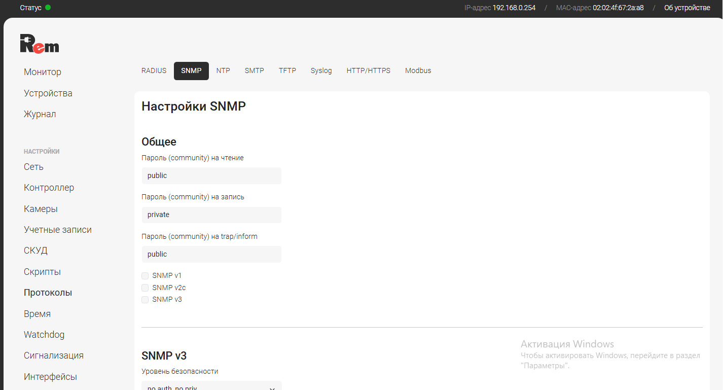 | Сетевые протоколы | SNMP v1/v2c/v3, HTTP/HTTPS, TELNET, TLS, SSHv2, IPv6, TFTP, RADIUS, NTP, SMTP, DNS, DHCP-клиент, Whatchdog, RADIUS, Modbus TCP, Modbus RTU поддерживается при отсутствии внешних устройств в контроллере. Возможность организации СКУД и системы мониторинга климата (с использованием внешних электронных ручек, НМІ дисплеев и датчиков) |